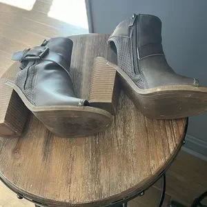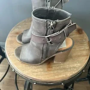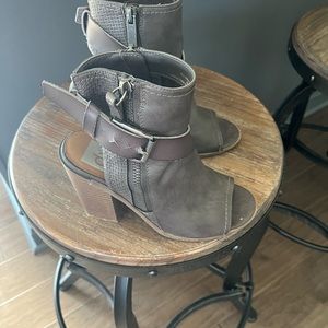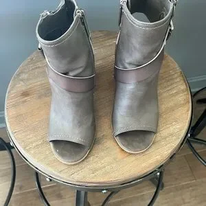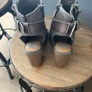 Cute block heels with zipper and buckle, open toe. 4” heel. Brownish gray