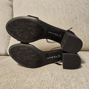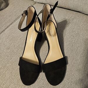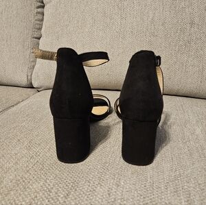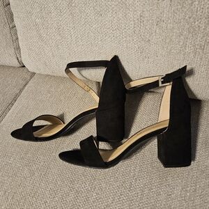 CL by Laundry black suede, strappy, open toed heels. Chunky block heels. Like new.