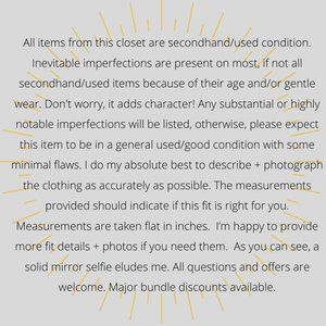 Happy to provide more fit details + photos. Accessories/other clothing not included.