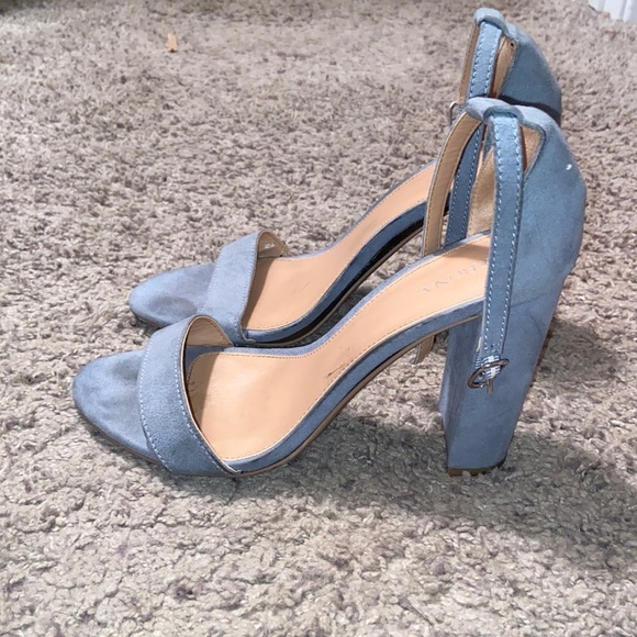 Pastel blue block heel sandals. About 4 inches. Only worn once, but there are toe marks and scuff marks on the back of the shoe (pictured). The sole is partially coming off as well due to the Arizona heat (pictured).