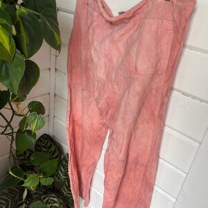 Naturally dyed with Madder Root. Size Large. Most of the designs are block printed. A few handpainted. Nothing on back. Print includes: bow, lavendar, shooting star, stamp, wine glass, flower. Pants have pockets. A cottage industry. Please not pants will not be perfect as the designs were hand done.