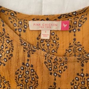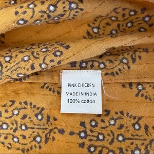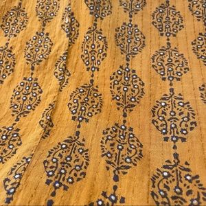 Lightweight cotton dress adorned with block-print pattern and subtle metallic thread. Simple shift style with center pleating on the skirt. Having straight sides means this isn’t ‘poufy’, it really is a genius design! Shows minor signs of wash and wear, in excellent condition. Rich mustard color that is hard to accurately portray. If you want more pictures or other info just ask! *Just discovered a teeny area of loose stitching. Price reduced!