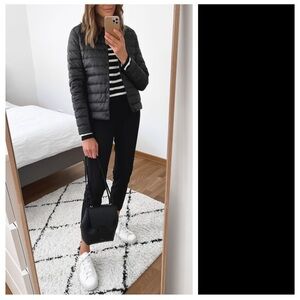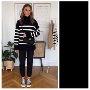 Ankle-length slacks in woven fabric with a high waist and extended waistband tab. Zip fly with concealed hook-and-eye fasteners, diagonal side pockets with decorative stud at top, and mock back pockets. Tapered legs with creases and short slits at sides.