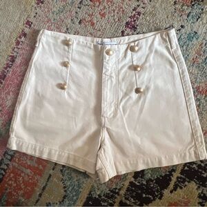 High-waist shorts with decorative golden buttons on the front. Rear patch pockets. Zip fly and top button fastening. Brand new with tags. Zara size 6, will provide measurements if needed. Color: cream, off white with gold buttons Stretch: none Design: High waisted jean shorts with embellished button details. Pockets in the back and belt loops. Material: Soft high quality material Length or fit: High rise, casual comfy fit Occasion: casual, neutral, chic, summer, spring, minimalist, party, vacation, beach