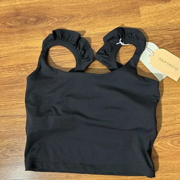 Blogilates black crop top with ruffled circular shoulder straps. Soft, stretchy fabric. Simple and modern look. Versatile styling piece. New with tags size Medium. Great price!!!