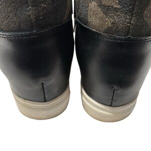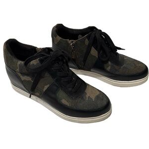 Blonde Goldy Wedge Sneakers, Size 7M, Camouflage & Black. Leather & suede. Wedge is built in. Insole 8.75”, Outsole 9.75” & Heel 2.25”. Lace up with side zippers. Very Good Condition. 910
