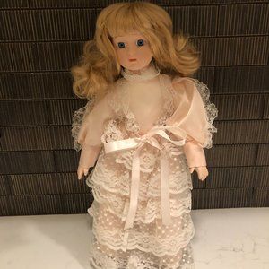 Blonde Hair/Blue Eyed Porcelain Doll in Pink Satin and Lace Dress