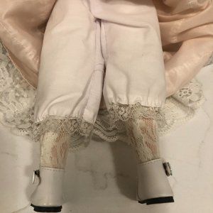Clothing includes long pink satin dress w/lace detailing, white pantaloons, and white shoes