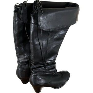 Blondi Knee High Tall Black Leather Heeled Boots Size 8.5 Zip up calf & Lace up