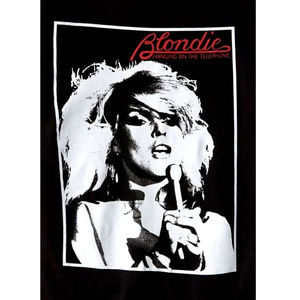 This black T-shirt from Blondie features a large front screen of Debbie Hurry Hanging on the Telephone. 100% Cotton.