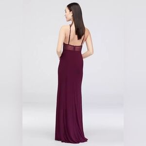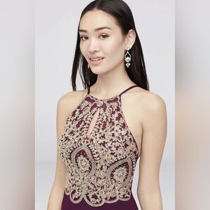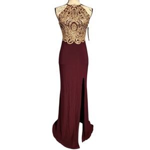 This exquisite gown showcases a sleeveless halter neckline with an intricate lace filigree bodice, perfect for making a statement at prom or cocktail events. The floor-length skirt in a rich wine hue features a dramatic slit, adding a touch of allure to its elegant silhouette.