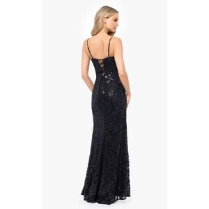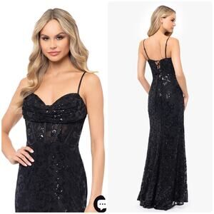 Blondie Nites Women's Black Sequin-Print Prom Dress Size 3 NWT. Long sequin-print black prom dress with a sheer corset bodice, sweetheart neckline, adjustable spaghetti straps, and a front leg slit. Back Zipper, Tie. Sequin Print, Sheer Corset, Adjustable Spaghetti Straps, Slit, Draped Front Bodice, Lace-Up Back. 100% Polyester, Sequin Mesh. Floor Length. Sweetheart neck. Natural Waistline.