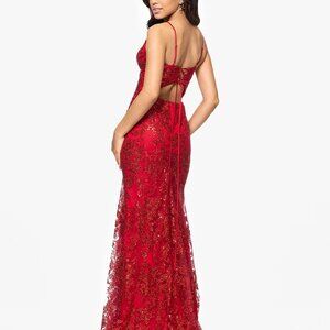 Dazzling glitter florals cascade down this flawless gown by Blondie Nites, perfectly sleek ready to wow the crowd thanks to a floor length design and extended slit. V-neck Tie closure at center back Glitter floral design throughout Sleeveless Lined Tailored fit through the chest, waist, and hips; sits close to the body Self: 96% polyester, 4% nylon; lining: 100% polyester