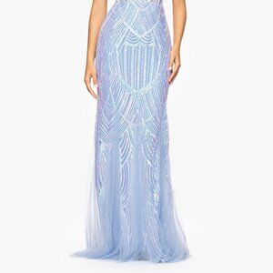 Sequin design throughout; floor sweeping skirt