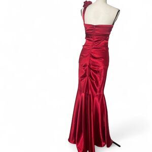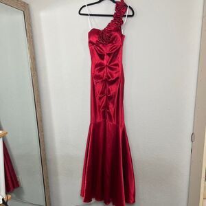 Blondie Nites Red Satin Dress Ruffle Mermaid Formal Gown Maxi Rhinestones Rose One Shoulder