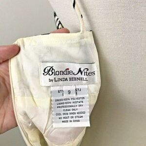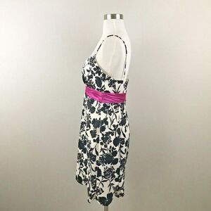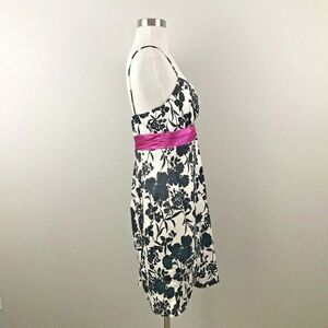 Blondie Nites Size 9 Juniors Dress Black Ivory Mini Floral Print Profess. Hemmed. Condition is Pre-owned. Blondie Nites Size 9 Made in China Dry Clean Material 100% Polyester; Lining: 100% Acetate Details Ivory and Black Floral Print Dress. Pink Waistline. V Neck. Spaghetti Straps. Zip Center Back. Bust Padding. Has been Professionally Hemmed from being a Long Gown. Approximate Measurements Chest 34", Waist 30", Hip 39", Length 36"
