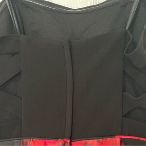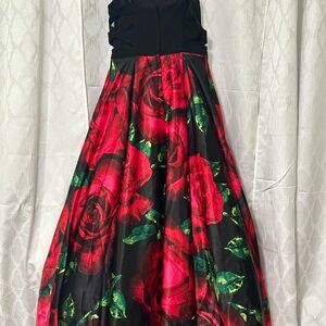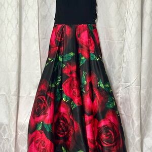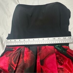 Look as gorgeous as a fresh bouquet of roses in our charming Sariah dress! She features a black hued bodice with a strapless sweetheart neckline, a built in no slip strip, padded cups, built in boning and lattice strap accents on the side with mesh insets. Her slim fit bodice leads to a satin red rose print ball gown silhouette accented with hidden side pockets, a petticoat and pleating details. Dress offers a relaxed fit with minimal stretch. Includes a back zipper closure criminal lighting on the inside of the dress creates a floaty ball gown feeling. Excellent like new condition.