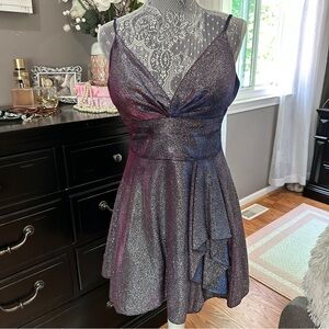 Dazzle at your next event in this eye-catching Blondie Nites by Stacy Sklar dress. This iridescent glitter mini dress features a deep V neckline, fitted waist, adjustable spaghetti straps, and a dramatic cascading ruffle detail at the skirt. The shimmer fabric shifts between deep plum, violet, and blue tones depending on the light—perfect for prom, homecoming, holiday parties, or nights out.