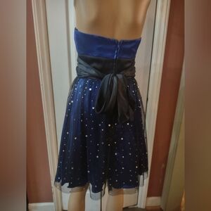 This is a nice PRE-OWNED Blondie Nites by stacy sklar strapless dress. It is blue with black tulle. This is in nice condition. Please see pictures.