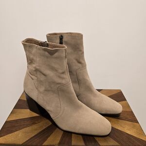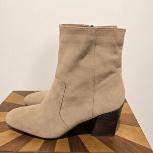 Blondo Sadie Boots. Tan Taupe suede leather ankle booties. Block heel. Waterproof.