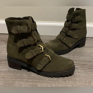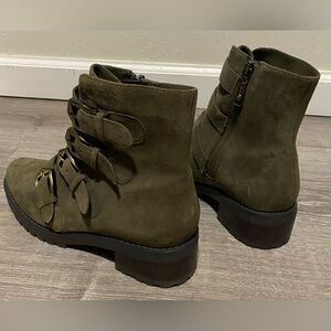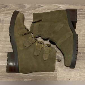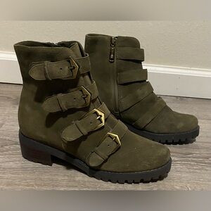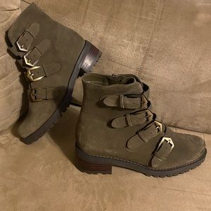 Waterproof outdoor slight heeled taupe | gray boots. Offering a side zip, along with 4 adjustable buckles up the front of the shaft. Small block heel and rubber non slip sole. Size 7.5M