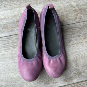 Lilac leather slip on shoes with sot elastic edges to hold shoe on. Comortable insole.