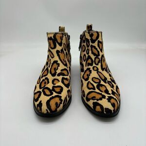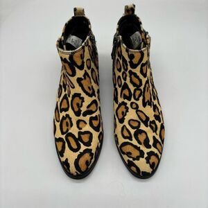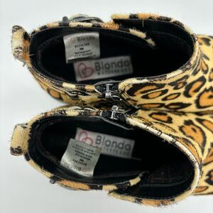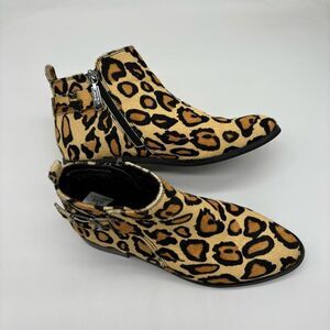 Leopard print calf hair waterproof upper with zipper closure and ankle buckle.