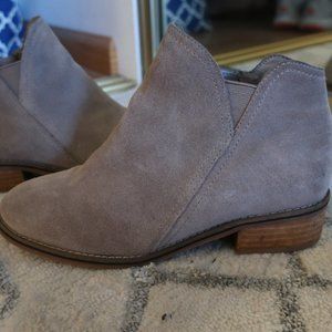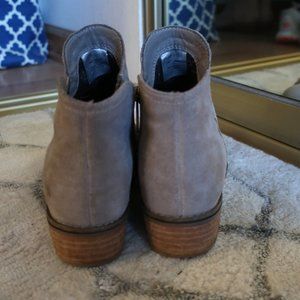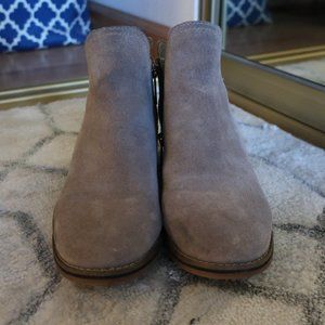 Cute and versatile taupe suede booties from Blondo. Super comfortable with low 1.25" block heel and side zip closures.