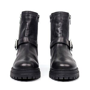 The side zipper allows for easy on and off, while the round toe and durable rubber soles ensure all-day comfort. Featuring a sleek moto-biker design, these boots are both edgy and versatile, ideal for any wardrobe.