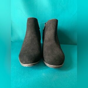 Chic black suede booties by Blondo. Versatile and stylish for any outfit. BLONDO, WOMENS’ ALIDA WATERPROOF BOOTIE, BLACK SUEDE UPPER, INSIDE ZIP CLOSURE, ROUND TOE, RUBBER SOLE, 2.25” BLOCK HEEL, size 9W, (NWT)