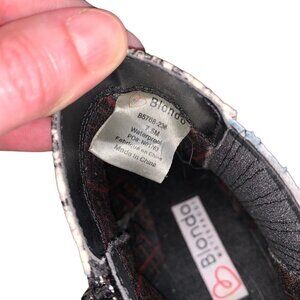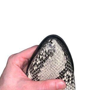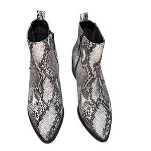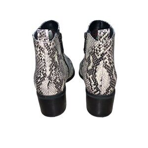 Blondo Women's Waterproof Noa Ankle Bootie in Size 7.5. Black Snake Skin Print , Leather Upper. Zipper Closure on the inside. Block Heel , just about 2.5 inches high. One very minor scuff on the toe of the left shoe as shown in the close up, otherwise in great condition, hardly any wear.