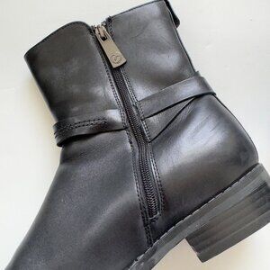 A sleek, buckled ankle strap wraps a lustrous little bootie crafted from waterproofed leather for a look that's equal parts practical and posh.