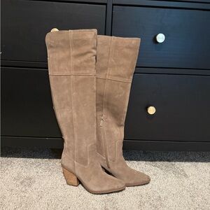 NEW Blondo Waterproof Windie Over the Knee Boots Taupe Suede Size 7 M Brand new- Nordstrom shelf pulls- No Box Over-the-knee boot crafted with waterproof leather for a confident stride in wet conditions. Features a 3.25-inch block heel for a stylish lift and an assertive posture. Inset side-zip closure provides easy wear and a streamlined silhouette. Comfort is ensured with memory foam cushioning for all-day wear. 8-inch shaft height and a 14-inch calf circumference, fitting a variety of leg shapes.