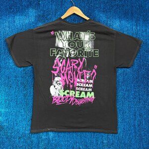 Blood Disgusting x Scream Hey Do You Like Scary Movies Tee L approx measures 22 inches pit to pit 28 inches long Never worn firsthand overstock in great condition has distressing (hole under the neck) from the manufacturing process