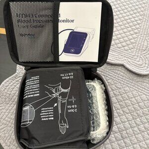 Full adult size blood pressure monitoring kit. New in box. Includes cuff, instruction manual, large read-out display and canvas carry case with zipper.