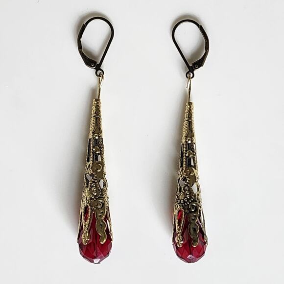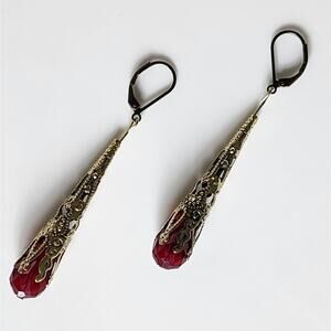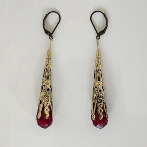 Blood red teardrop stones inside golden filigree dangling earrings. 3" Long.