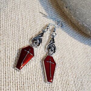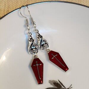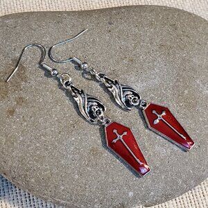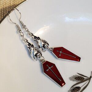 Blood Red Vampire Coffin Hanging Bat Silver Cross Goth Enamel Chain Earrings