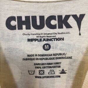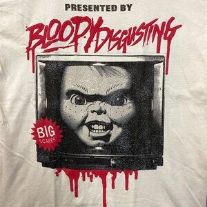 Bloody Disgusting X Chucky Child's Play Horror Beige T-Shirt Medium. Generally measures 19 inches pit to pit and 28 inches Long. Amazing graphic design shirt, perfect for horror and Chucky fans. New never worn overstock in great condition.