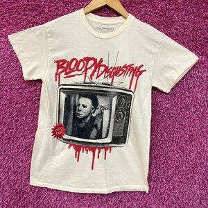 Bloody Disgusting x Michael Myers Double Sided Horror T-Shirt Medium. Generally measures 18 inches pit to pit and 25 inches long . Amazing graphic design t-shirt depicting Michael Myers, perfect for horror fans. never worn first hand overstock great condition with an amazing graphic