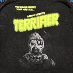 Bloody Disgusting x Terrifier Art the Clown Horror Tee XL approx measures 24 inches pit to pit and 30 inches long never worn first hand overstock in great condition has distressing from the manufacturing process