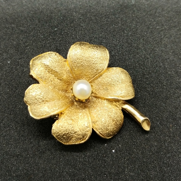 Goldtone and faux pearl vintage flower brooch. It also has a fixture on the back so it can double as a pendant!