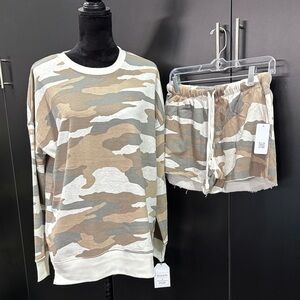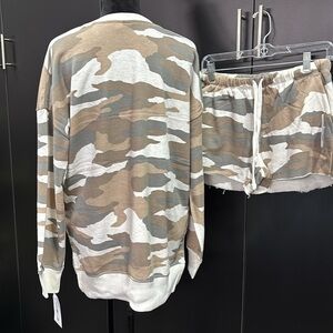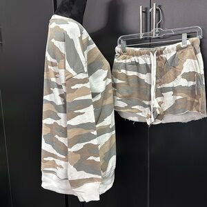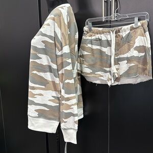 Bloom & Pop 2 pc. Tan Camo set, pullover sweatshirt,elastic waist pocket shorts