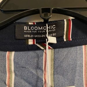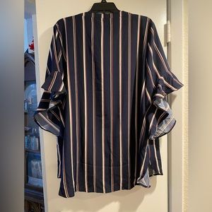Size 18-20 Navy Blue with White and Red Stripes, Ruffle sleeves, Button down Top by BloomChic Approximate measurements are PTP:22 Length:30