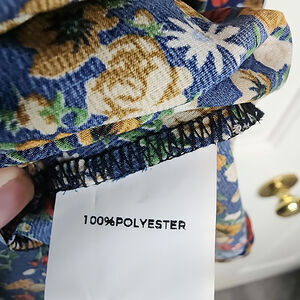 Ditsy floral dress with high neck. Base color is dark blue. Has pockets. Size 10 which is a medium based on BloomChic's size chart