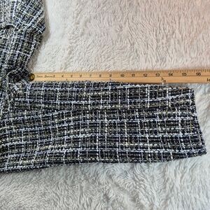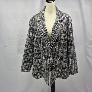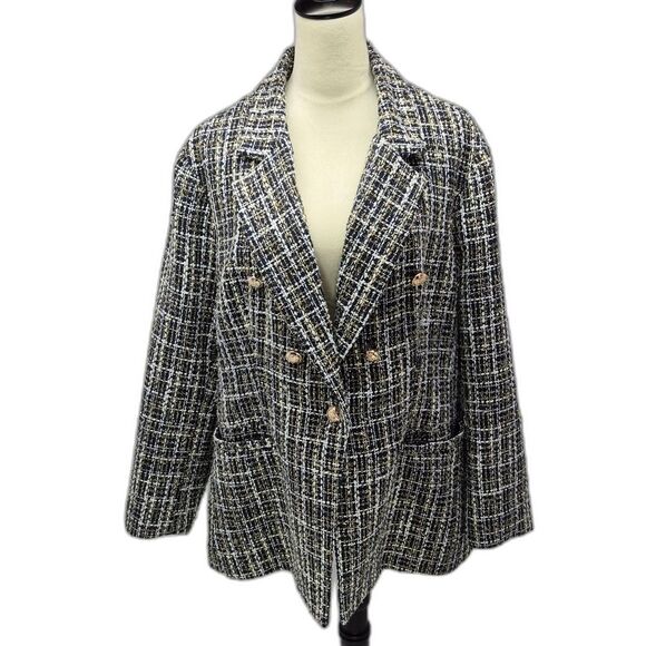 Chic tweed blazer with a classic double-breasted style. Features a sophisticated pattern and gold button accents. Perfect for versatile wear.
