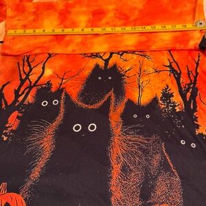 BloomChic V-neck long sleeve in fiery sunset orange with black cats, bats, jack-o’-lanterns, and trees front and back. Smooth, stretchy knit with an easy, relaxed fit that pairs perfectly with leggings.