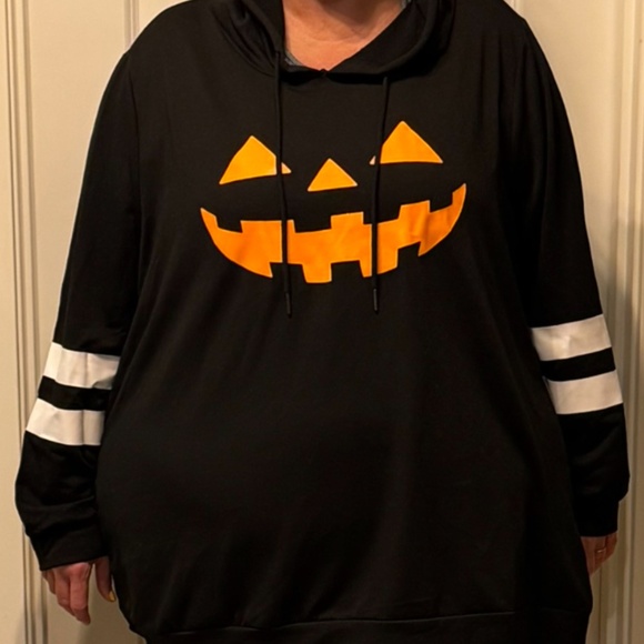 Soft black pullover hoodie with bright jack-o’-lantern graphic, drawstring hood, drop shoulders, and varsity sleeve stripes. Roomy, relaxed fit with slight high-low hem—perfect for pumpkin patches, movie nights, or handing out candy.