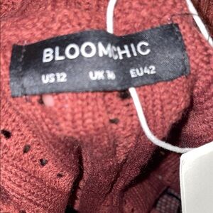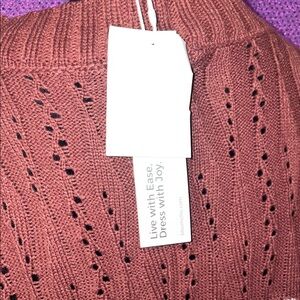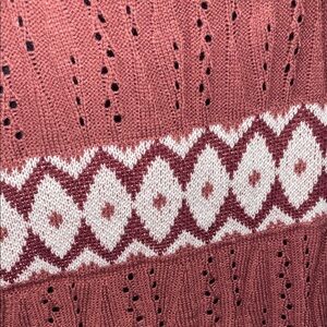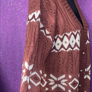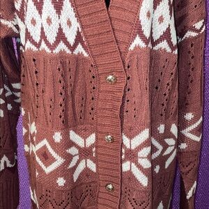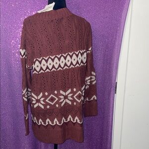 New with tags. Chic maroon cardigan with white geometric patterns. Features button-down front. Ideal for layering.