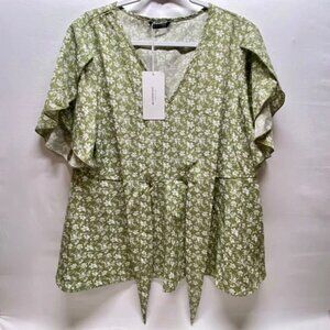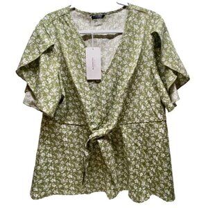 BloomChic Tie Front Floral V-Neck Blouse Women's Size 14-16 Sage Green Flowy NWT