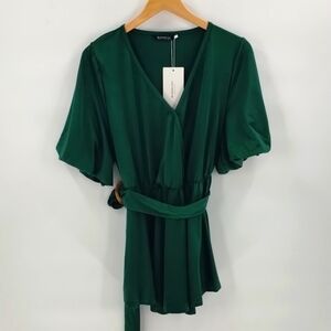 BloomChic blouse v neck green 14-16 pocket puff sleeve with belt snap closure
